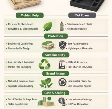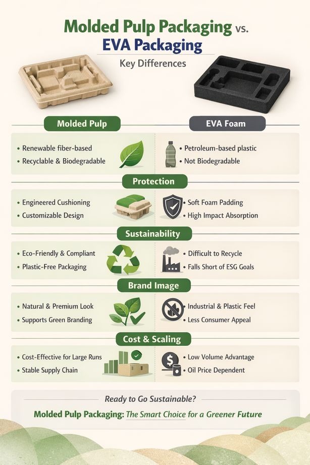 molded pulp packaging, EVA packaging, molded fiber packaging, sustainable packaging, eco-friendly packaging, plastic-free packaging, molded pulp vs EVA